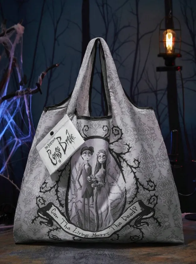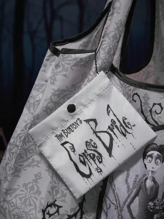 Sombria, romântica e prática: a Bolsa Compacta Corpse Bride é o acessório perfeito para quem carrega o estilo gótico no coração. Com arte oficial do filme "A Noiva-Cadáver", essa bolsa dobrável exibe Victor e Emily cercados por galhos espinhosos e a icônica pergunta: "Can the living marry the dead?"
