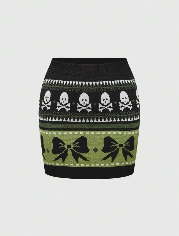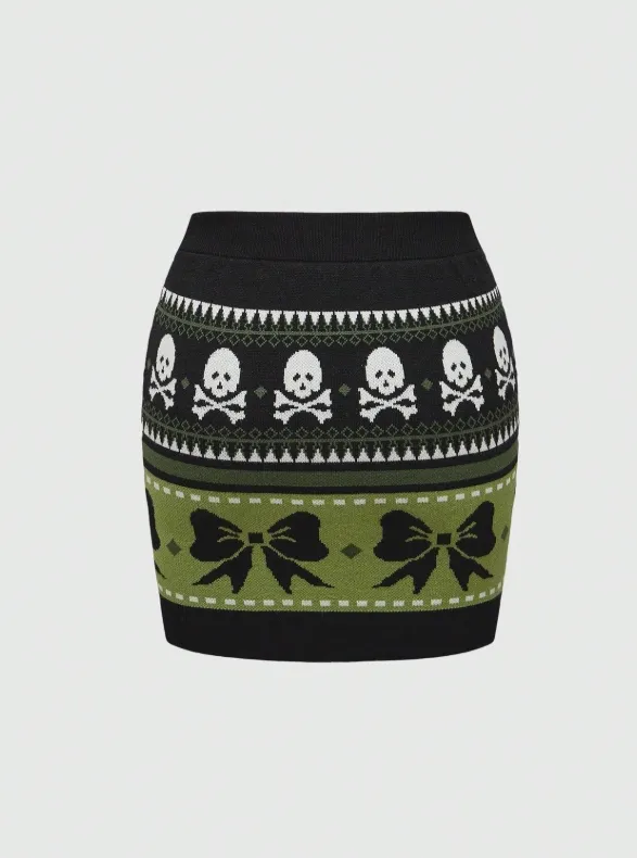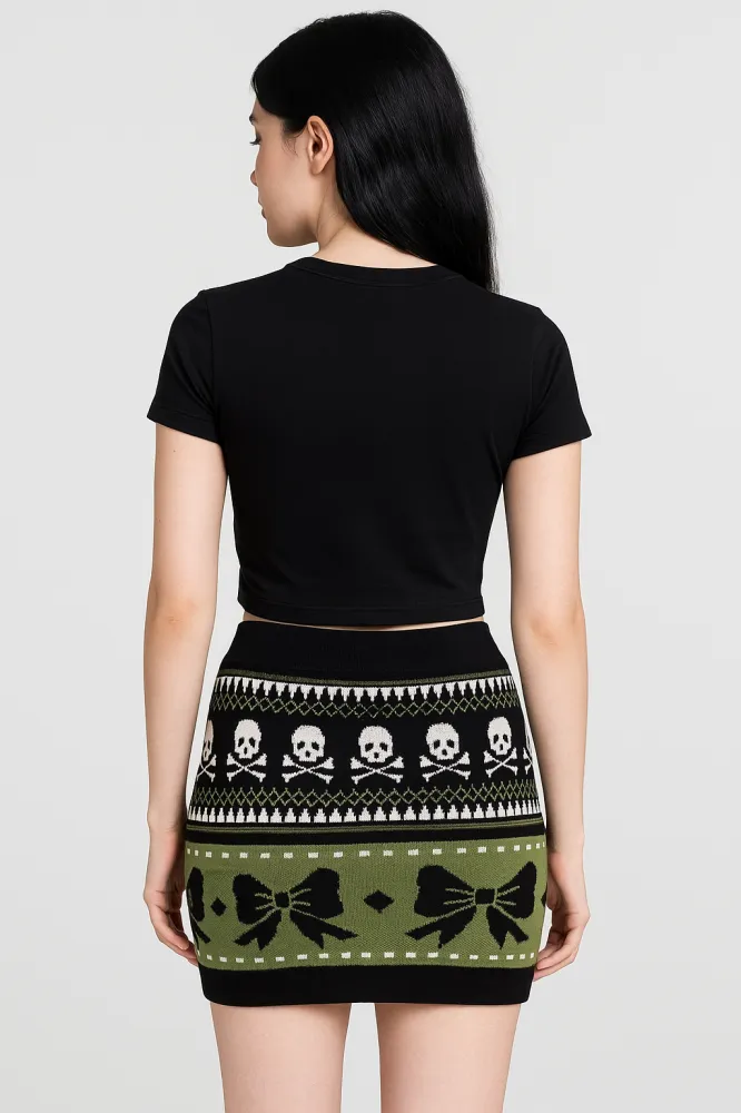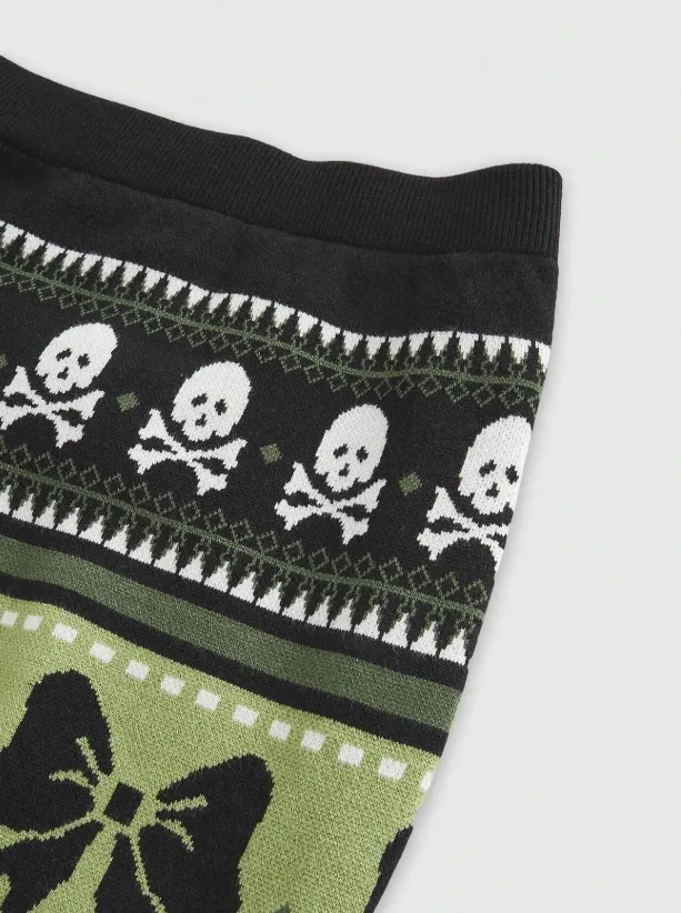 Com estampa gótica em verde musgo, preto e branco, ela mistura caveiras e laços em um