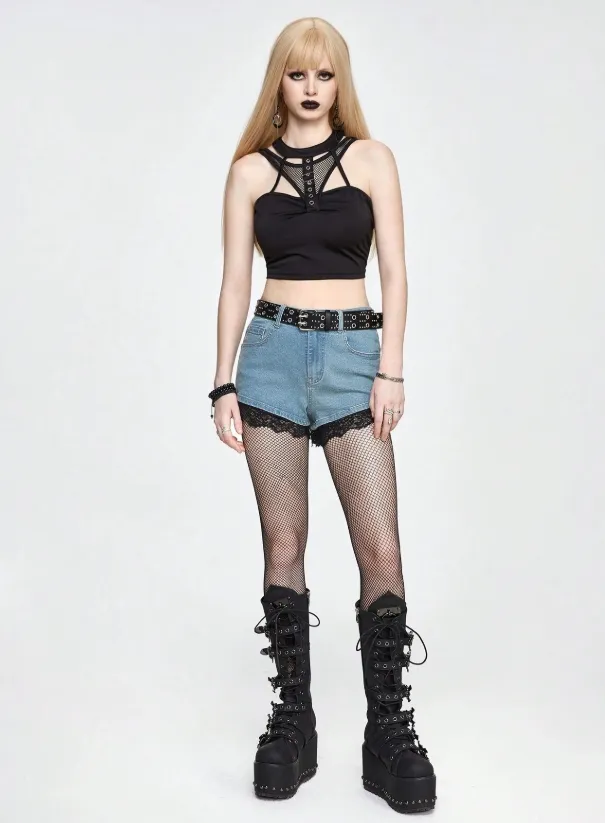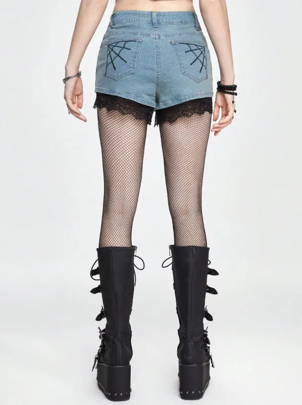 A barra em renda preta traz o contraste perfeito entre delicadeza e rebeldia, enquanto os bolsos traseiros com bordado de teia entregam a vibe sombria na medida certa.
