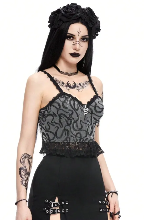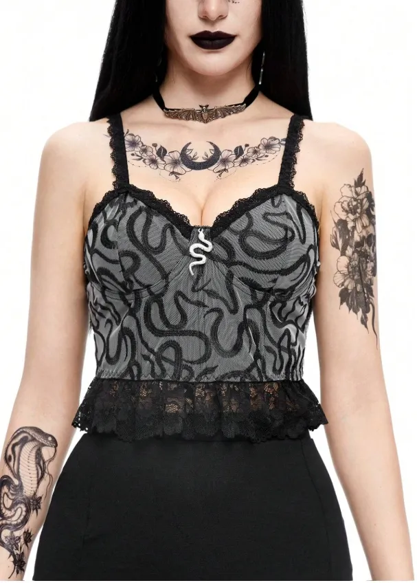 O top corset Instinto Selvagem combina renda delicada, estrutura marcante e bordados de serpentes que parecem ganhar vida sobre o tecido.
