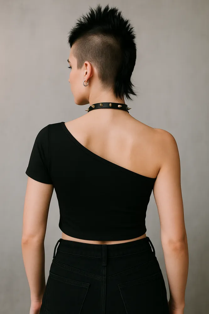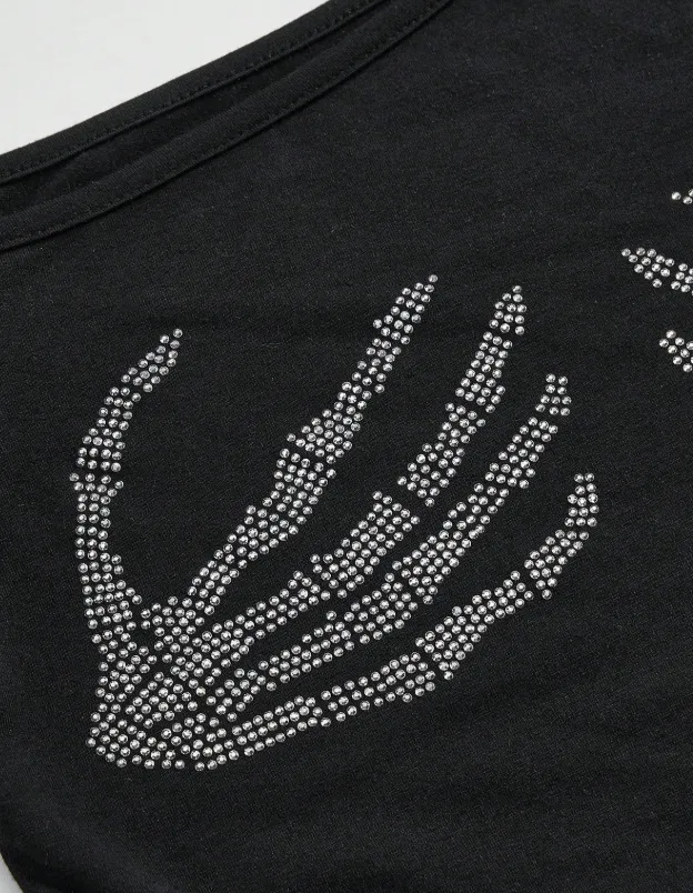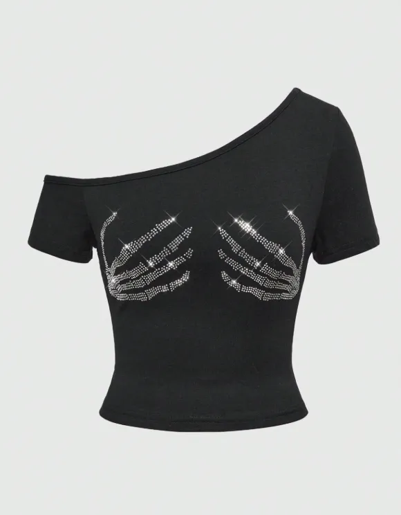 Com decote assimétrico de um ombro só e modelagem justa, o Toque Fatal combina o toque sombrio das mãos esqueléticas com o brilho certeiro dos strass.